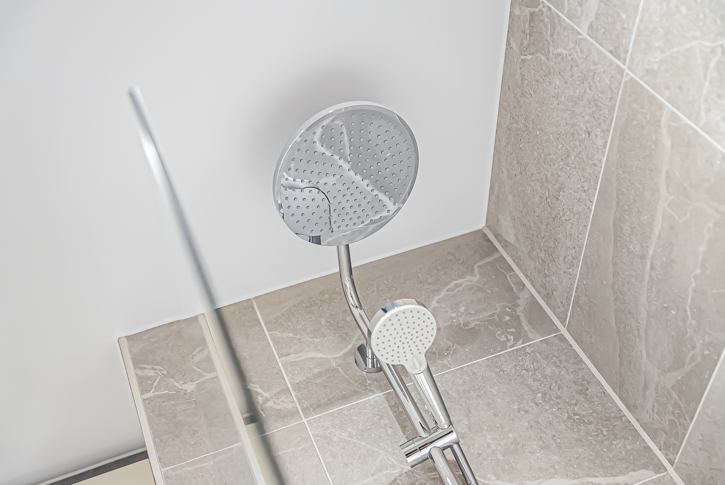 - Bathroom with bath and shower over