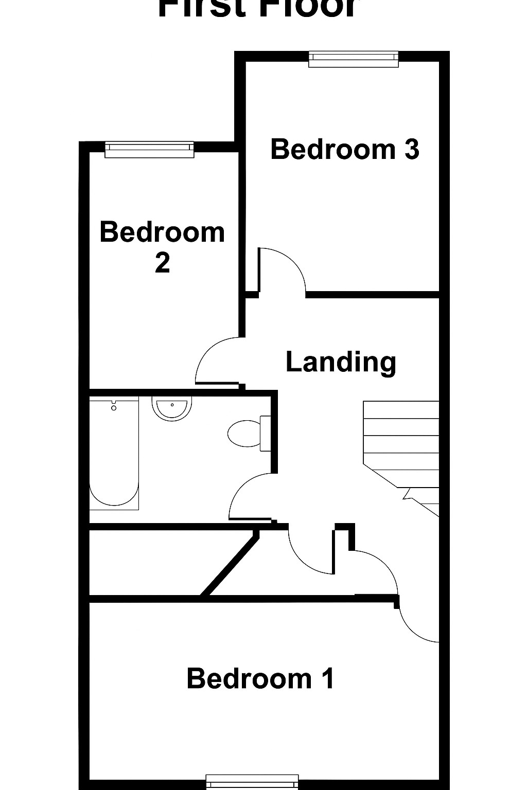 Upstairs, the first floor offers three good-sized bedrooms and a modern family bathroom featuring a panel bath with shower and glass screen, vanity-unit sink, toilet, tiled splashbacks, tiled flooring, and a chrome heated towel rail.